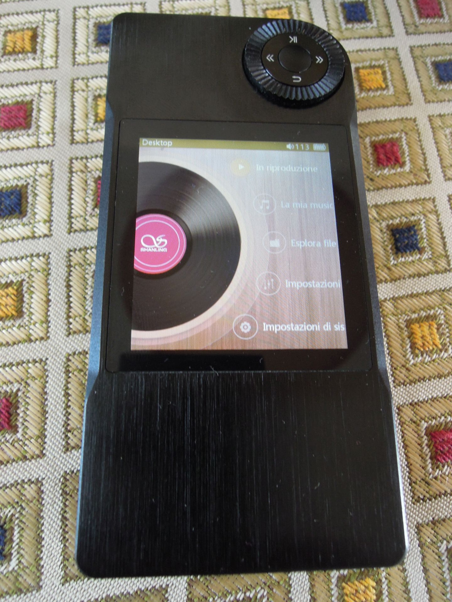 I materiali per il case sono di elevato livello: alluminio demagnetizzato e sul posteriore fibra di carbonio. Sul frontale vi sono anche uno schermo da 2,35” e una rotella multifunzione in plastica. Sul top vi sono le uscite audio (una per cuffie ed una condivisa per uscita coassiale ed uscita di linea analogica). Sul fondo vi è la porta micro USB, mentre sul lato vi è il pulsante d’accensione e lo slot per schede micro SD.