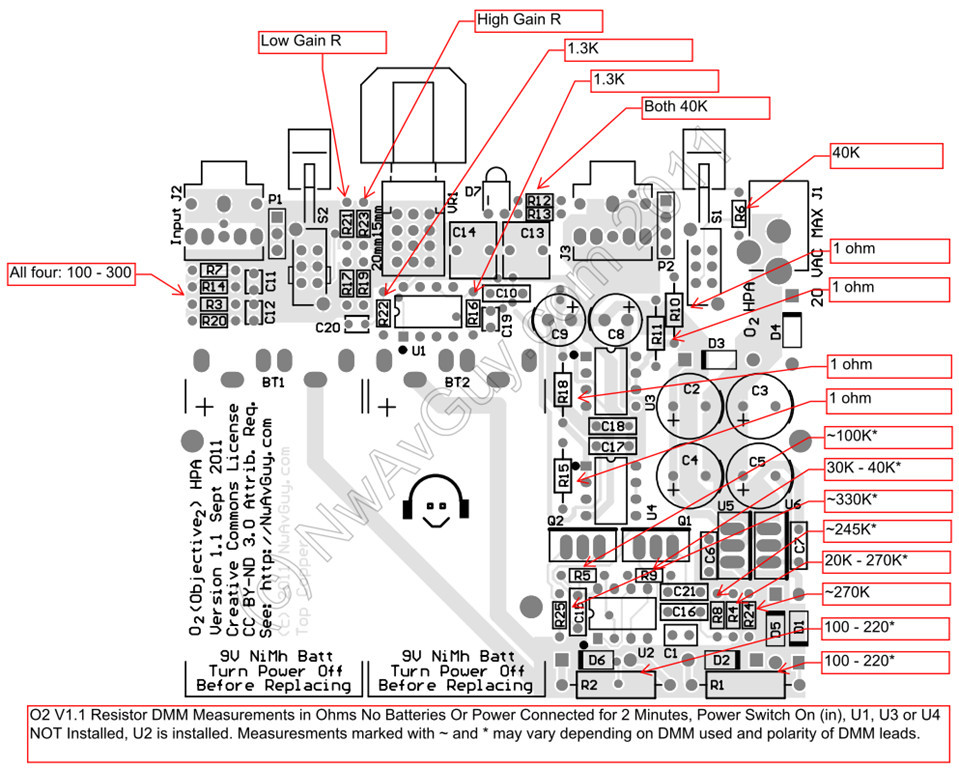4. non esagerate col Gain, la corrente continua (fa  friggere le vostre cuffie) aumenta col Gain, ma in modo almeno x2, valori di Gain che superano i 6.5 proposti solitamente portano gli operazionali a buttar fuori il massimo della corrente continua che possono erogare, ok valori bassi non sono un problema con cuffie di bassa impedenza, ma con cuffie ad alta impedenza invece sono estremamente rischiosi e potreste dover dire addio alle vostre cuffie. Inoltre tale valore è ottimale anche per il THD+N per gli operazionali presenti nell’O2 e in buona parte degli operazionali ad uso audio. Un valore di G=6.5 significa un voltaggio di uscita compreso tra i 6.5V se l’ingresso è di un singolo Volt, ma ben 13V se l’ingresso è quello standard di 2V. Considerando che gli operazionali arrivano senza problemi legati al THD+N con uscite fino a 10V non è il caso di esagerare dato che 13V è un valore già limite di per sé oltre il quale il THD+N cresce seguendo una funzione esponenziale.
